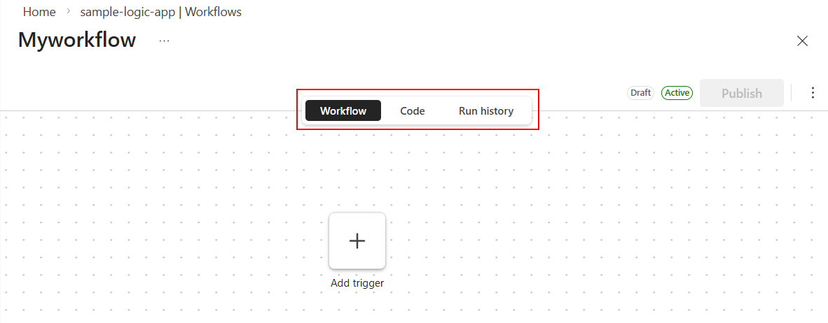 若要打开工作流的不同视图,请在设计器顶部的 视图选择器上,选择 “工作流”、“ 代码”或 “运行历史记录”。