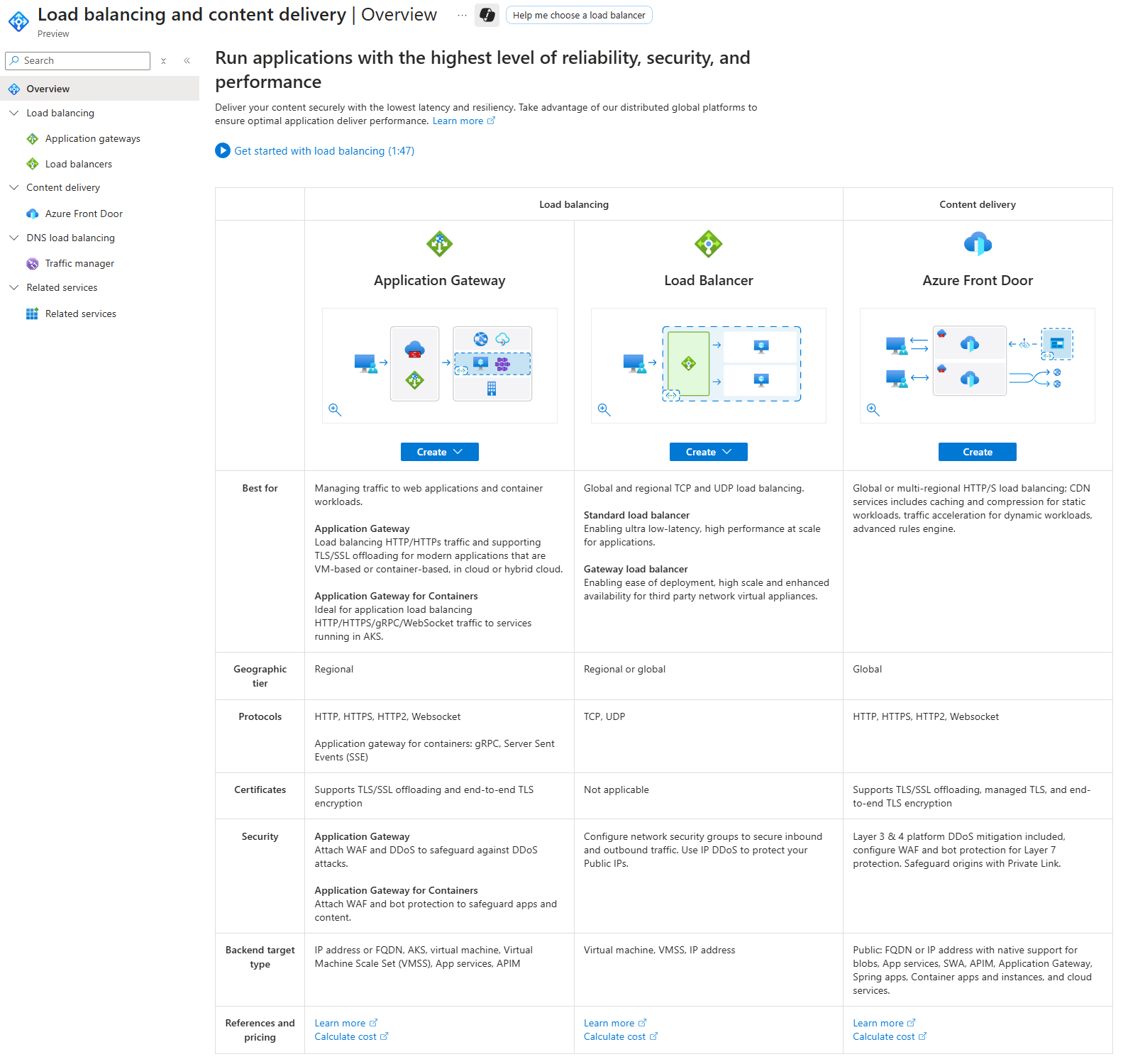 Azure 门户提供了一种集中体验,用于 选择负载均衡和内容交付服务。 可以从门户创建和管理负载均衡器、应用程序网关和前门。 门户提供配置服务的引导式体验,包括设置路由规则、运行状况探测和其他设置。