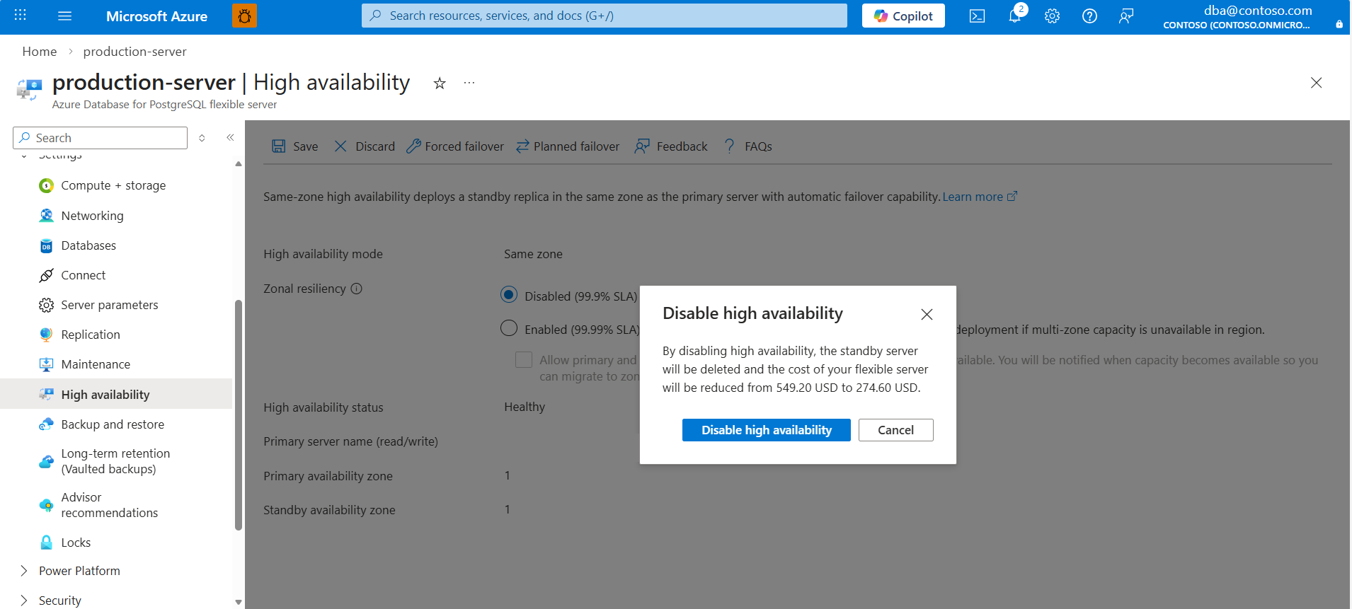 不再需要保护备用副本时,可以在 Azure Database for PostgreSQL 灵活服务器实例上禁用高可用性。 禁用高可用性会删除备用服务器并降低成本,但服务器不再受到区域或服务器故障的保护。