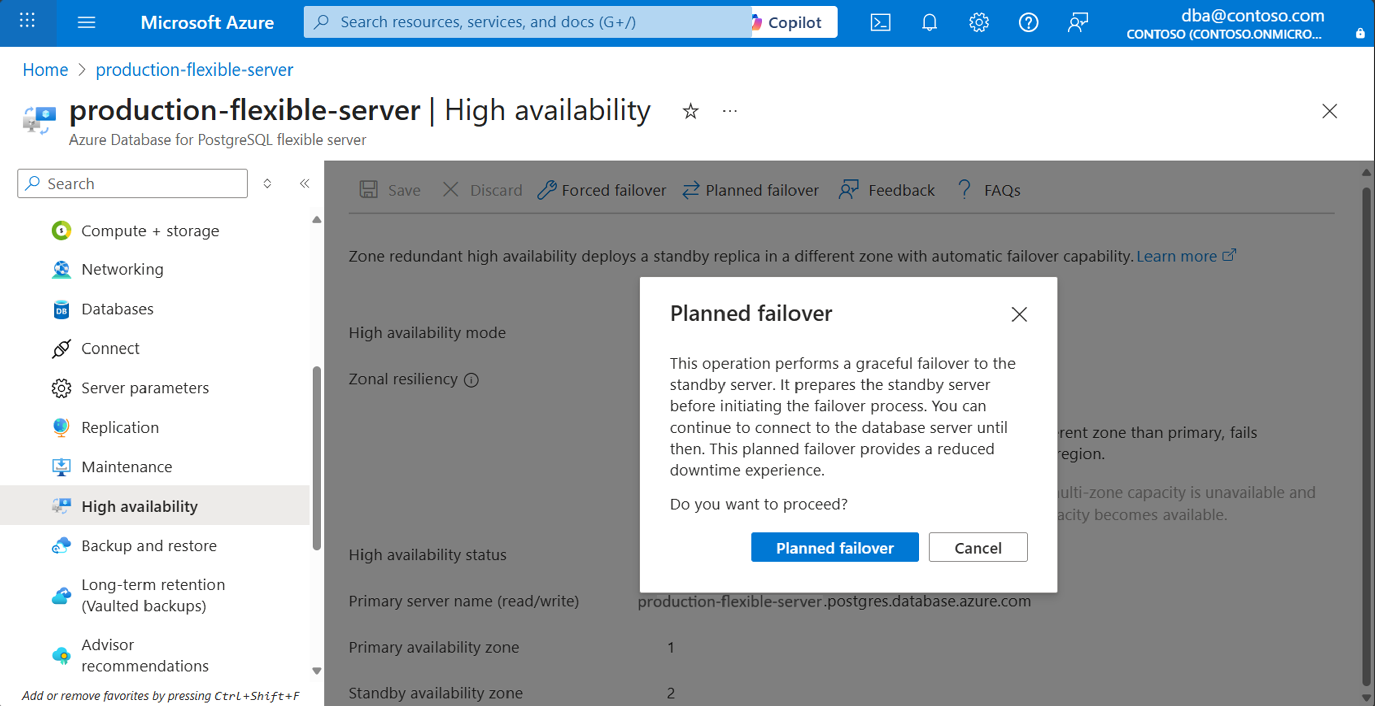 按照以下步骤,在 Azure Database for PostgreSQL 中执行从主服务器到备用服务器的计划的故障转移。 启动此操作会准备备用服务器,然后执行故障转移。
