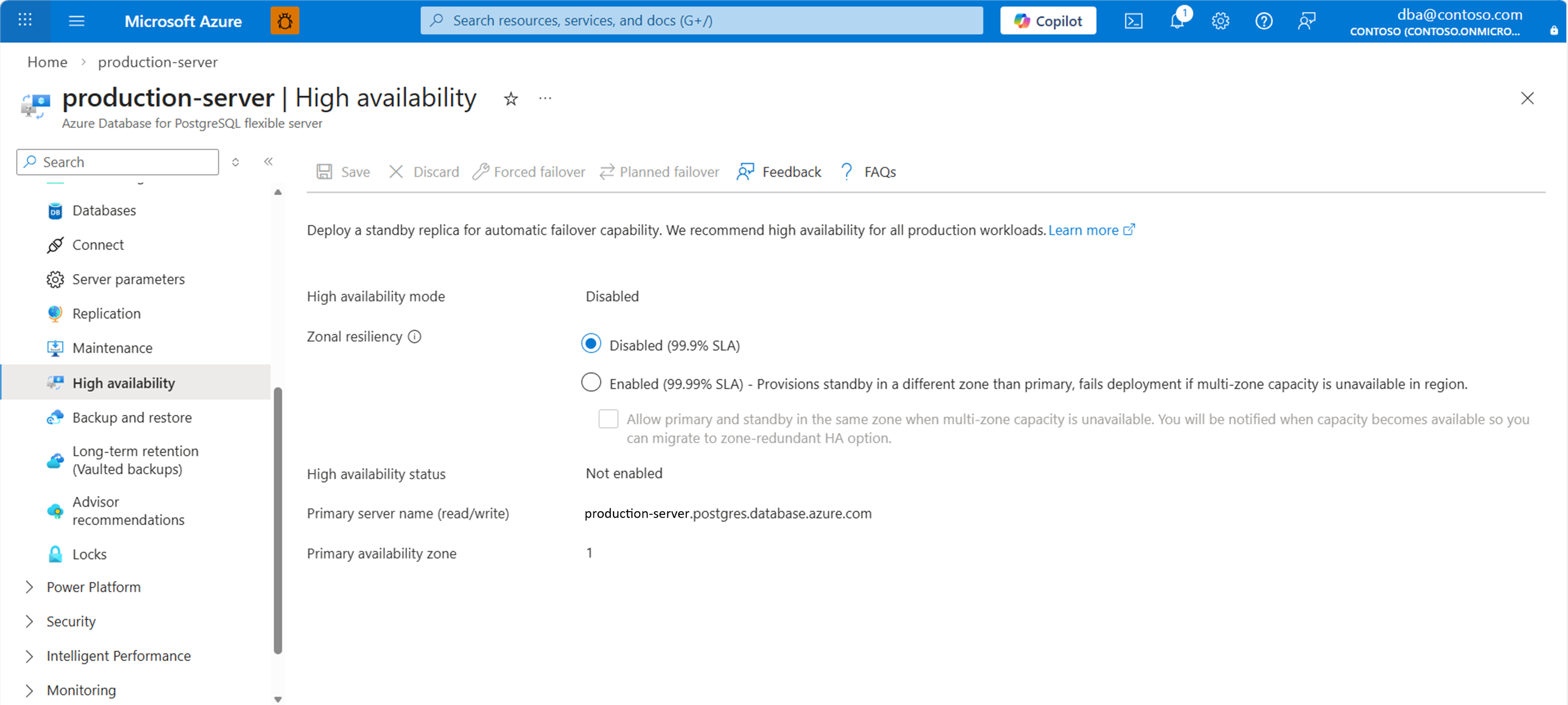 在 Azure 门户中,选择已启用高可用性的 Azure Database for PostgreSQL 灵活服务器实例。