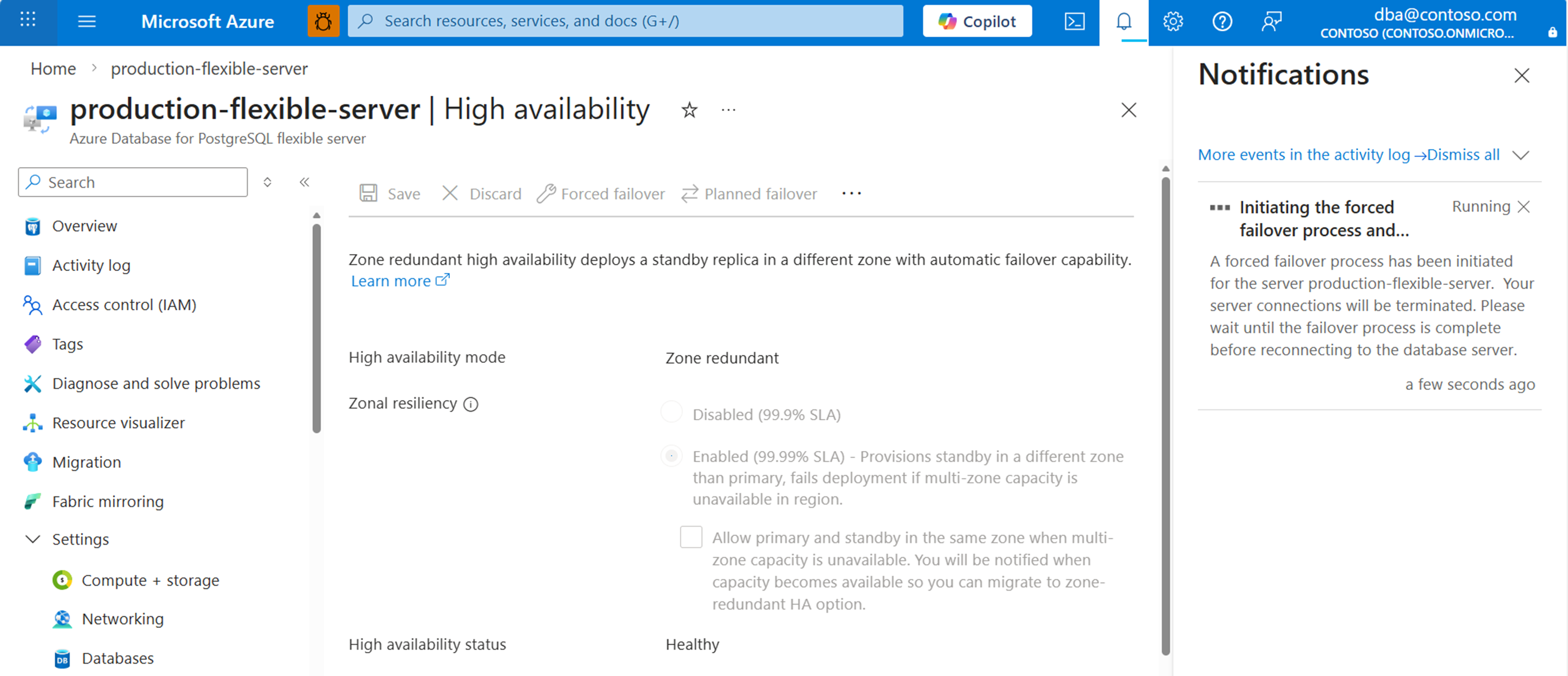 如果高可用性模式设置为“区域冗余”,请注意分配给“主要可用性区域”和“备用可用性区域”的值。 故障转移操作完成后,恢复这些值。