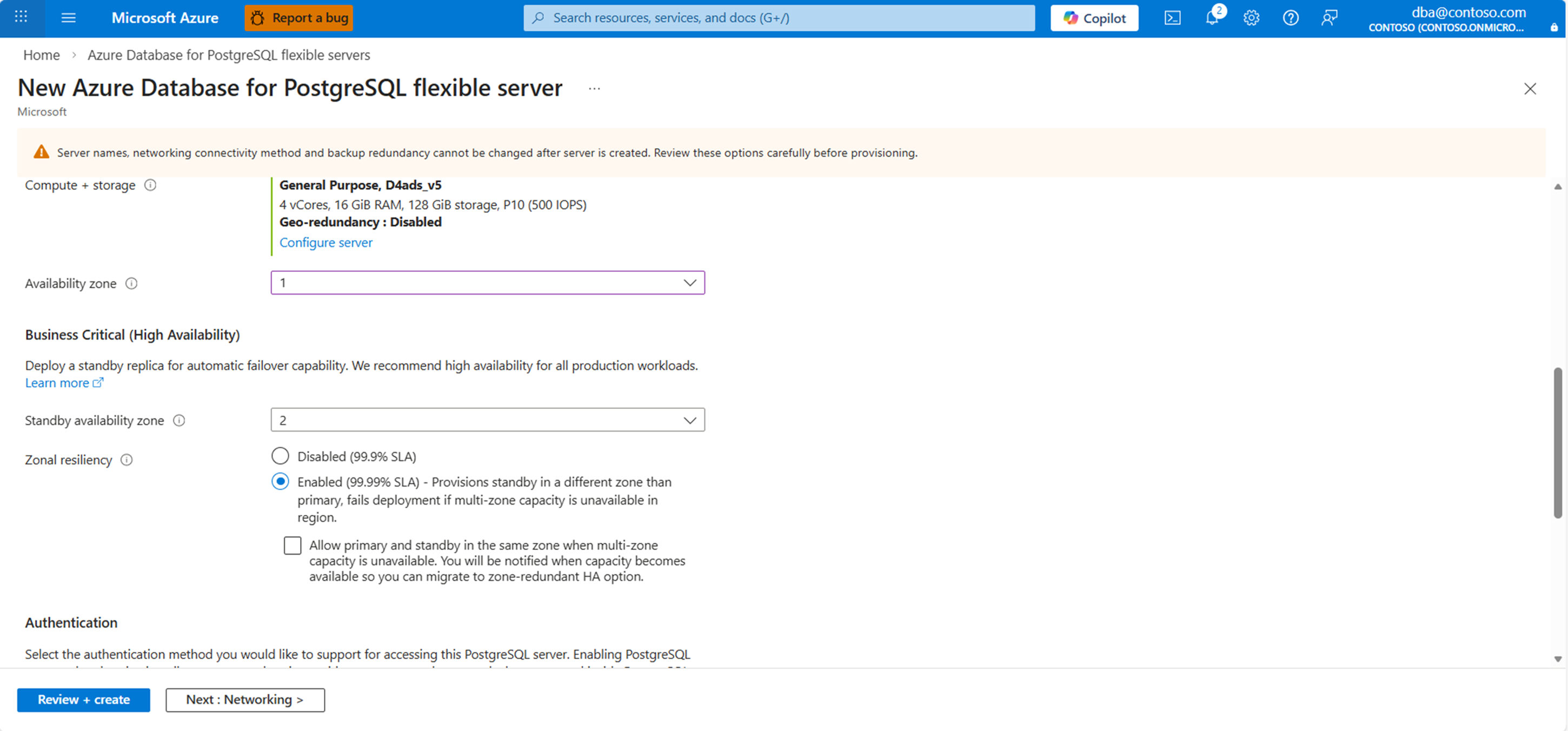 - 默认情况下,服务器尝试在不同的可用性区域中创建备用服务器,并采用 区域冗余 HA 模式,以实现最大区域复原能力。