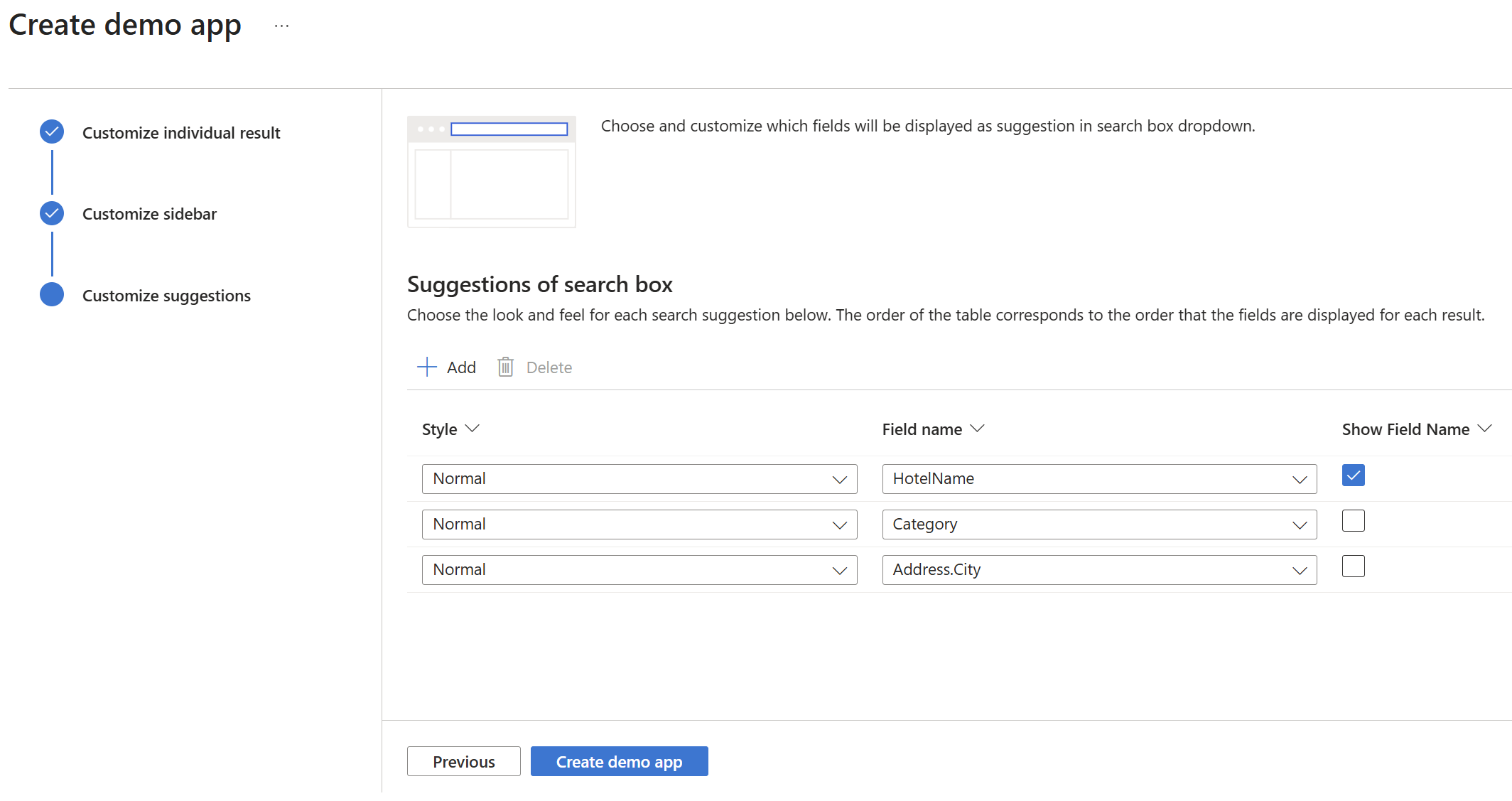 使用Azure portal中的 创建演示应用向导生成在浏览器中运行的可下载的“localhost”样式 Web 应用。 根据其配置方式,生成的应用在首次使用时就能正常运行,并与搜索服务上的索引建立实时只读连接。 默认应用可以包含搜索框、结果区域、边栏筛选器和自动提示支持。
