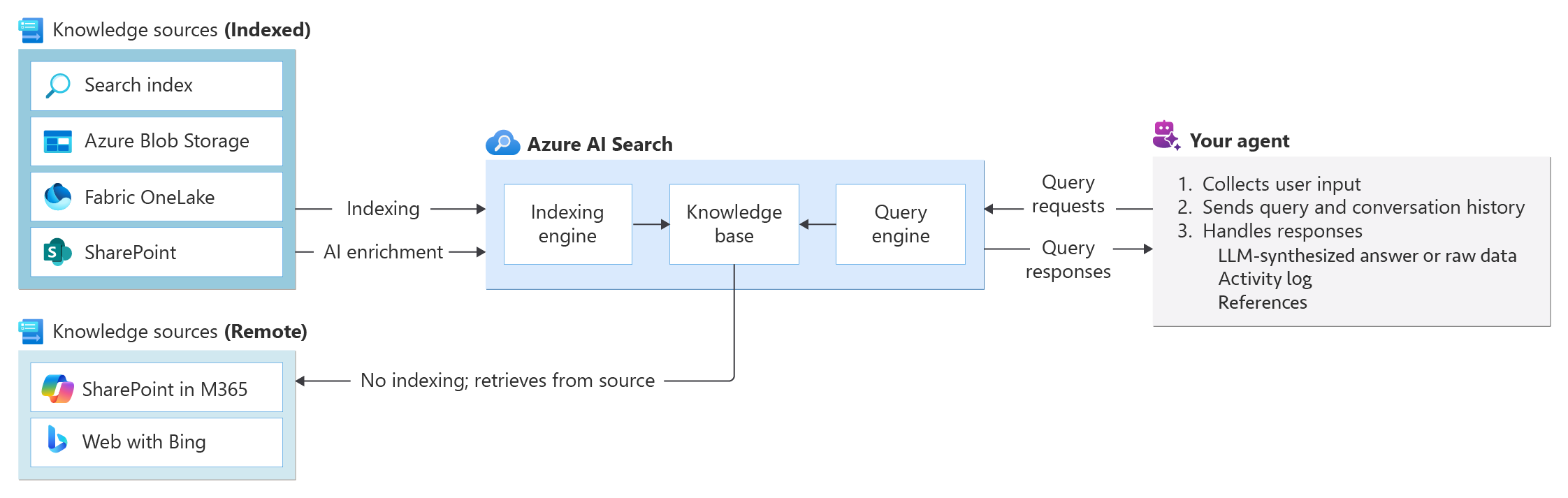 在后台,代理检索基于经典搜索体系结构构建,方法是添加协调多源检索的上下文层(知识库)。 知识源可以编制索引或远程:索引源使用与经典搜索相同的索引和查询引擎,而远程源绕过索引编制并实时查询。