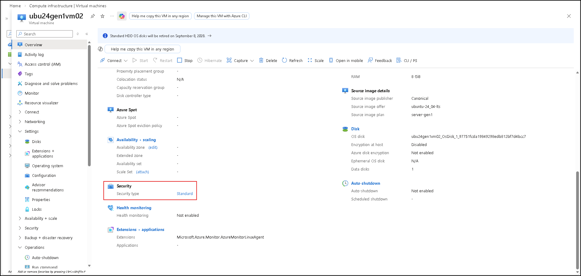更新成功完成后,关闭“配置”页。 在 VM 属性中的“概述”页上确认“安全类型”设置。