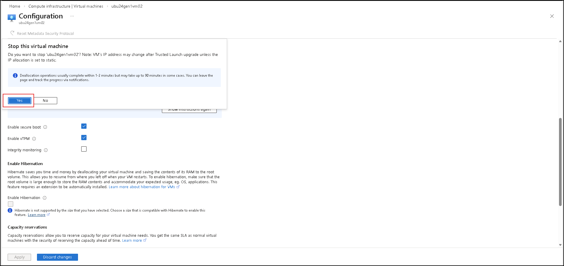 需要 解除分配 VM 才能完成升级。 单击“ 是”确认 VM 解除分配操作。