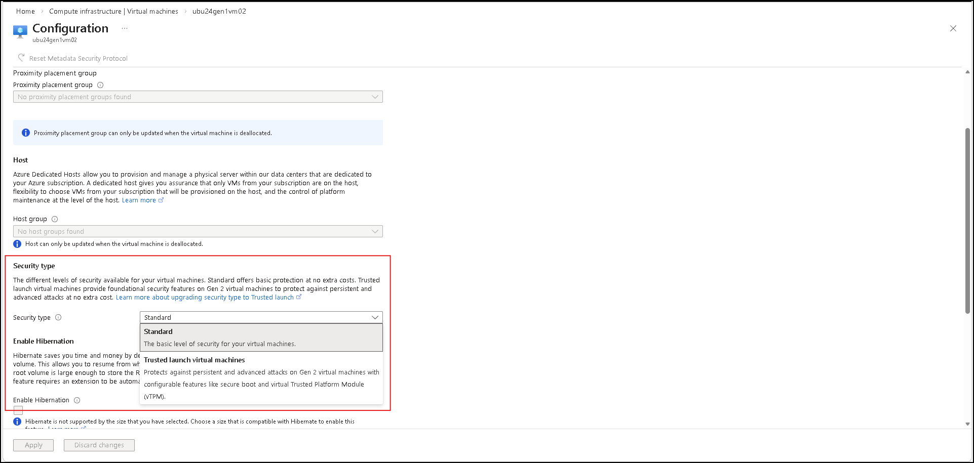 对于不满足升级到受信任启动先决条件的第 1 代虚拟机,请查看如何满足这些先决条件。 例如,如果使用不受支持的虚拟机大小,请查找支持受信任启动的等效受信任启动支持的大小。