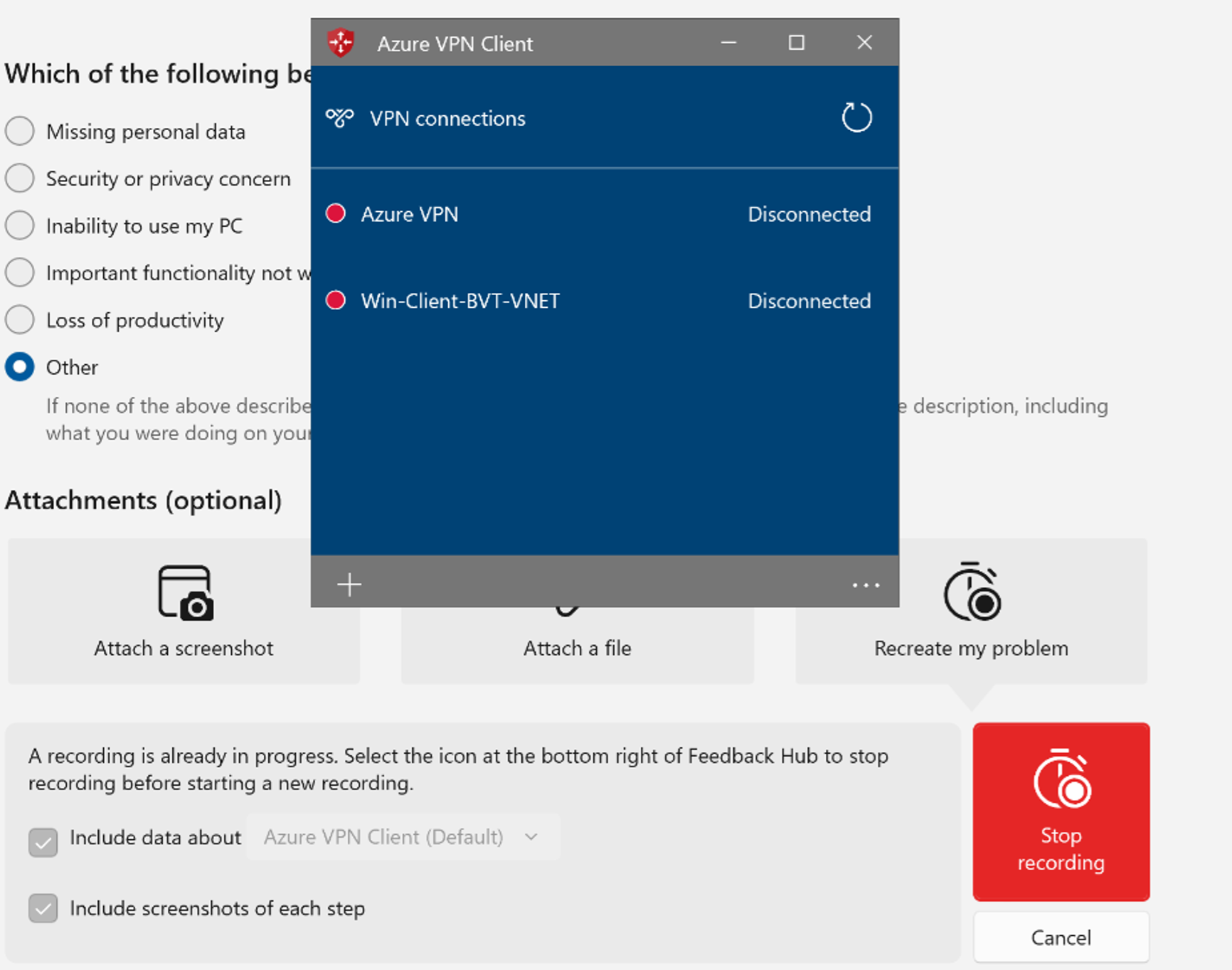 本文帮助你使用反馈中心应用报告 Azure VPN 客户端问题或改进 Azure VPN 客户端体验。 使用本文中的步骤,帮助收集日志、发送文件和屏幕截图并查看诊断。 本文中的步骤适用于 Windows 10 和 Windows 11 操作系统以及 Azure VPN 客户端。