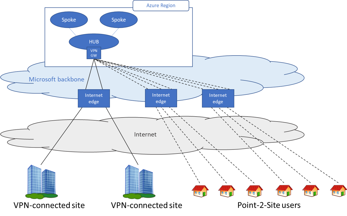 通过点到站点 (P2S) VPN 网关连接,可以创建从单个客户端计算机到虚拟网络的安全连接。 可通过从客户端计算机启动连接来建立 P2S 连接。 对于要从远程位置(例如在家里或会议室)连接到 Azure VNet 或本地数据中心的远程工作者,此解决方案很有用。 有关 Azure 点到站点 VPN 的详细信息,请参阅关于 VPN 网关点到站点 VPN 和 VPN 网关常见问题解答。
