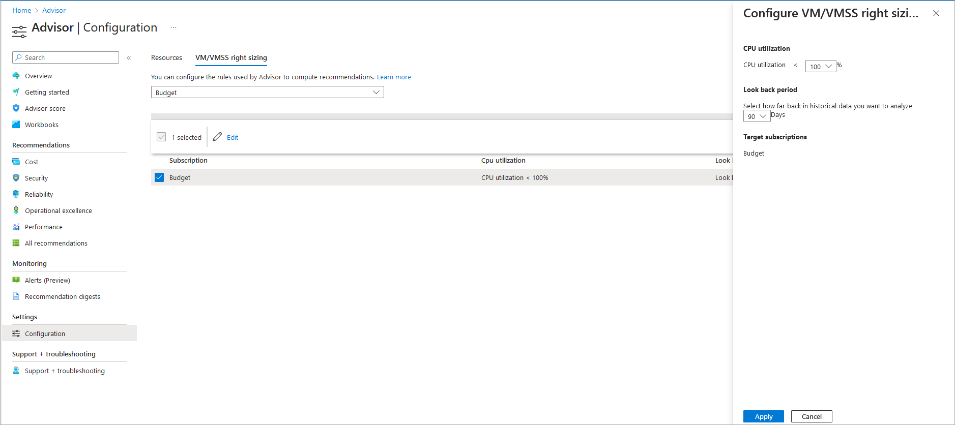可以调整顾问虚拟机(VM)和虚拟机规模集的建议。 具体而言,可以为每个订阅设置一个筛选器,以便仅显示针对具有特定 CPU 使用率的计算机的建议。 此设置将筛选建议,但不会更改其生成方式。