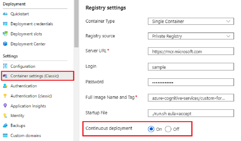 mcr.microsoft.com/azure-cognitive-services/custom-form/labeltool:latest-2.1 - 持续部署 - 如果想要在开发团队对示例标记工具进行更改时接收自动更新,请设置为“启用”。