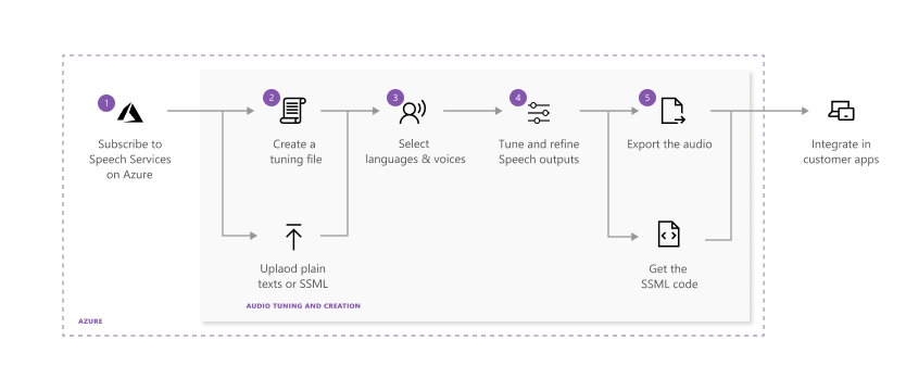 - 开发人员友好:可以收听输出音频并调整 SSML 以提高语音合成。 然后,可以使用语音 SDK 或语音 CLI 将 SSML 集成到应用程序中。