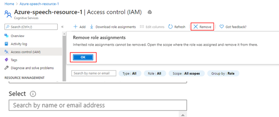 在 Azure 门户中搜索“Azure AI 服务”,然后选择要从中移除用户的语音资源。