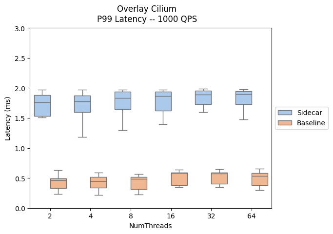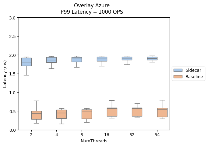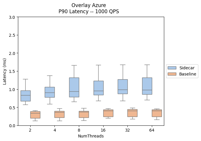以下结果评估了向数据路径添加挎斗代理的影响,展示了 P90 和 P99 延迟。