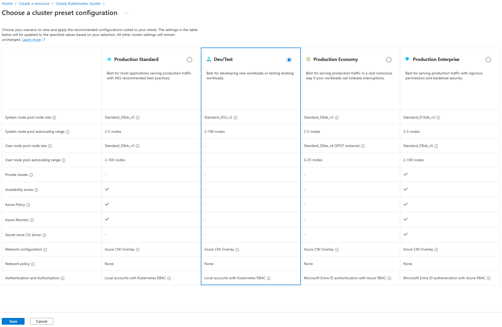 - 群集预设配置:选择“开发/测试”。 有关预设配置的更多详细信息,请参阅 Azure 门户中的群集配置预设。 创建群集时,可以通过选择“比较预设”并选择其他选项来更改预设配置。
