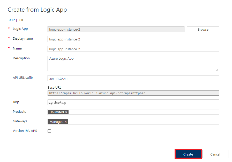 如果希望发布 API 并可供开发人员使用,请切换到 “完整 ”视图并将 API 与 产品相关联。 此示例使用 无限制 产品。 (可以在创建时或稍后通过“设置”选项卡将你的 API 添加到产品中。)