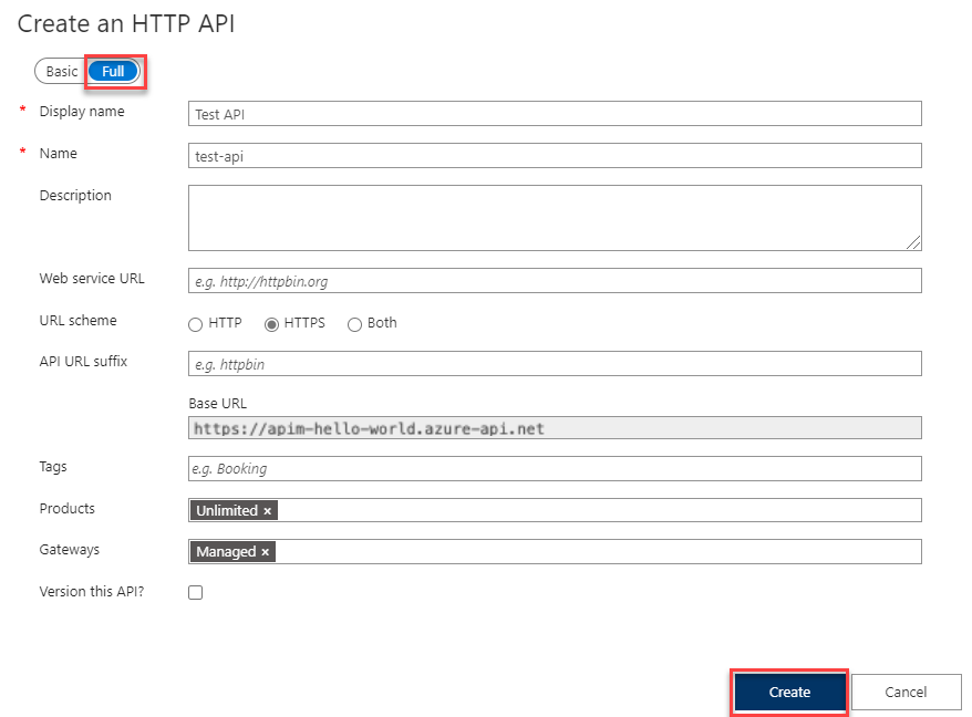 在 “产品”中,选择“ 无限制”(如果该值可用)。 此值仅在某些层中可用。 可以将本教程的值留空,但需要将 API 与产品相关联才能发布它。 有关详细信息,请参阅 导入并发布第一个 API。