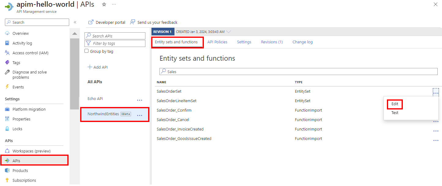 API 将添加到 API 列表中。 OData 元数据说明中公开的实体集和函数显示在 API 的“实体集和函数”选项卡上。