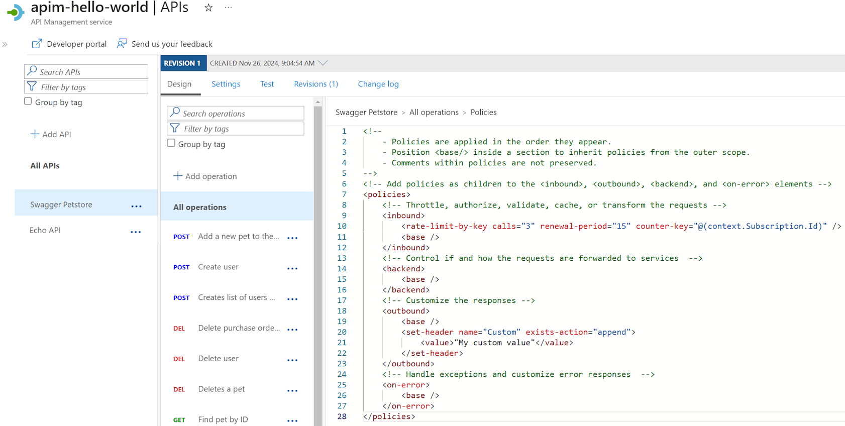 例如,你可能希望设置自定义响应标头。 或者,配置速率限制策略来保护后端 API,因此开发人员不会过度使用 API。 这些示例简单介绍了API Management策略。 有关更多策略选项,请参阅 API Management 策略。