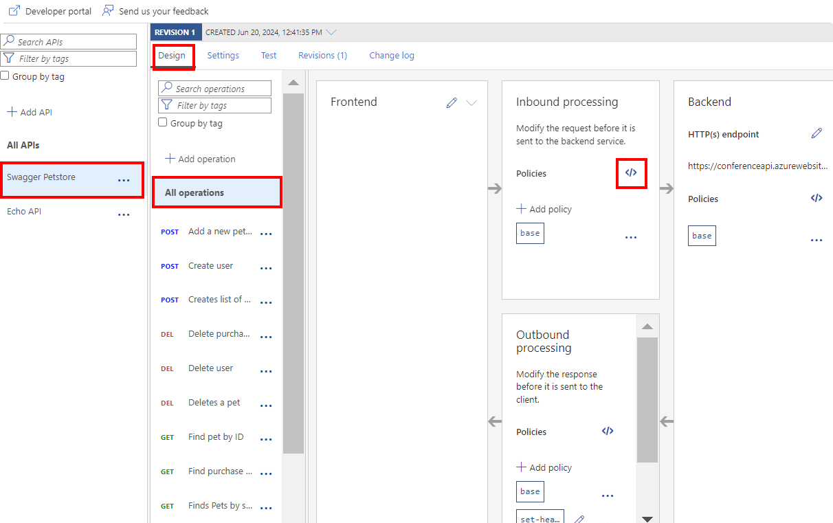 - 在API Management服务实例中,选择 APIs>APIs。