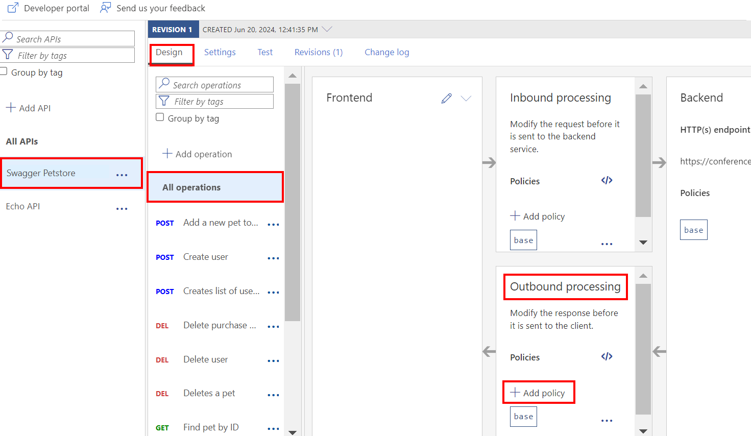 配置后,“set-header”策略元素会在“出站处理”部分出现。