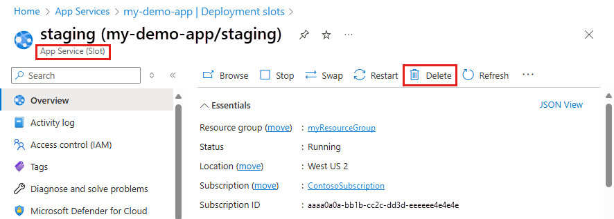 选择“部署”“部署槽”>“要删除的槽”“概述”>>。 应用类型将显示为“应用服务(槽)”,以提醒你正在查看部署槽。