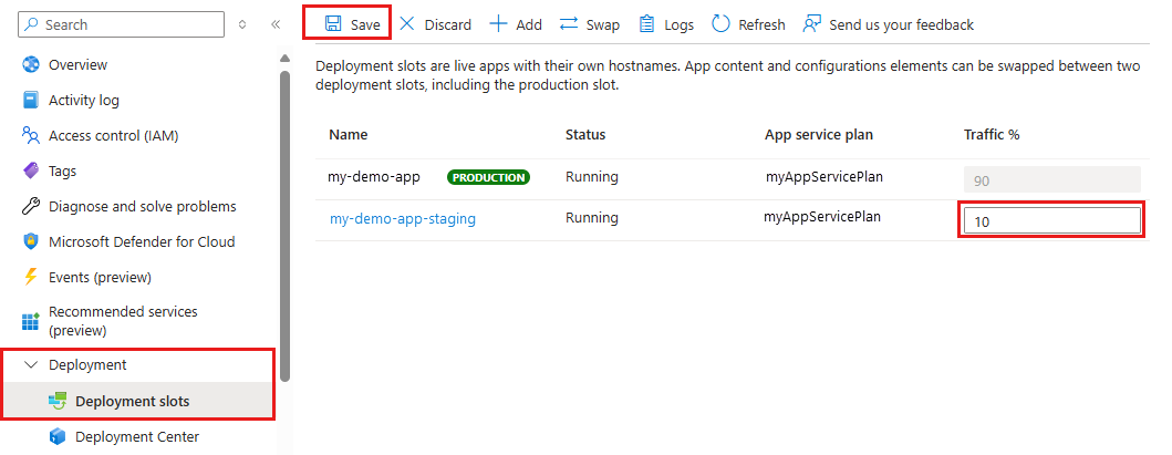 默认情况下,对应用生产 URL 的所有客户端请求都路由到生产槽。 可以将部分流量路由到另一个槽。 如果需要新更新的用户反馈,但尚未准备好将其发布到生产环境,此功能非常有用。