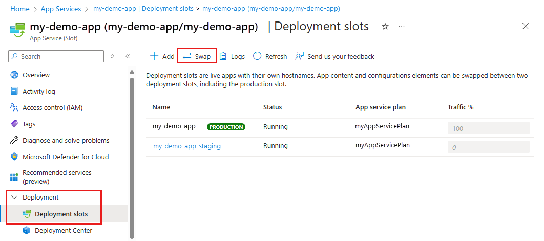 可以在应用的“部署槽”页上以及“概述”页上交换部署槽 。