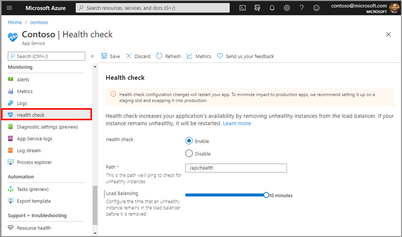 本文介绍如何使用 Azure 门户中的运行状况检查来监视应用服务实例。 运行状况检查通过重新路由来自不正常实例的请求,并替换仍然不正常的实例来提高应用程序的可用性。 此操作通过你选择的路径每分钟 ping 一次 Web 应用程序。
