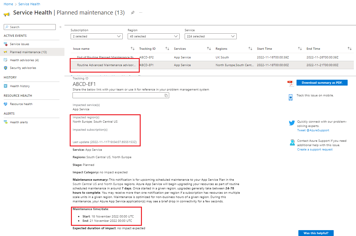 客户通常有多个在不同时间升级的应用程序。 为了避免为每个应用程序发送通知,我们发送一个捕获多个资源的通知。 我们将在维护开始和整个维护时段发送通知。 如果维护时段很长,你可能会收到针对同一推出的多次提醒,因此你可以更轻松地关联任何重启、中断或其他问题。