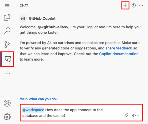 你可能已经注意到,创建 codespace 时,GitHub Copilot 聊天视图已经存在。 为了你的方便,我们在容器定义中包含了 GitHub Copilot 聊天扩展(参见 .devcontainer/devcontainer.json)。 但是,需要 GitHub Copilot 帐户(提供 30 天试用期)。