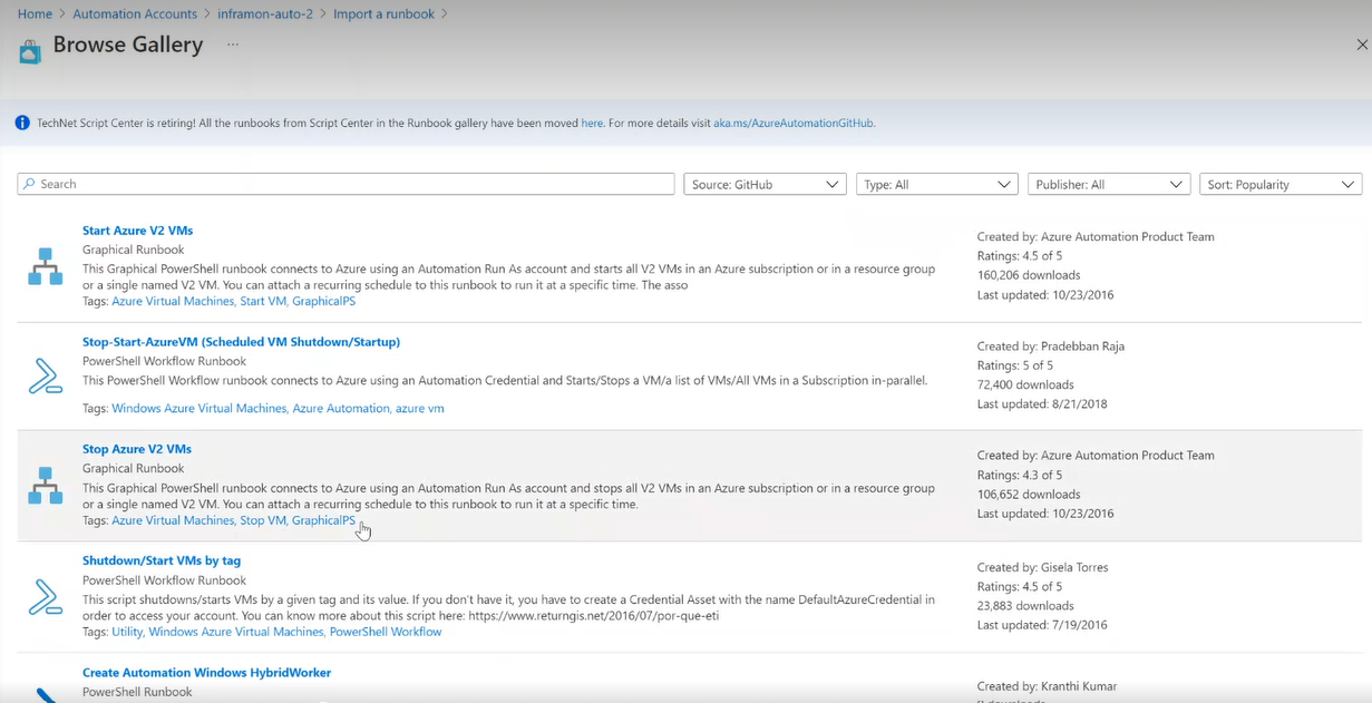 TechNet 脚本中心即将退役。 脚本中心的 Runbook 库中的所有 runbook 都已转移到自动化 GitHub 组织。有关详细信息,请参阅将 Azure 自动化 runbook 移动到 GitHub。