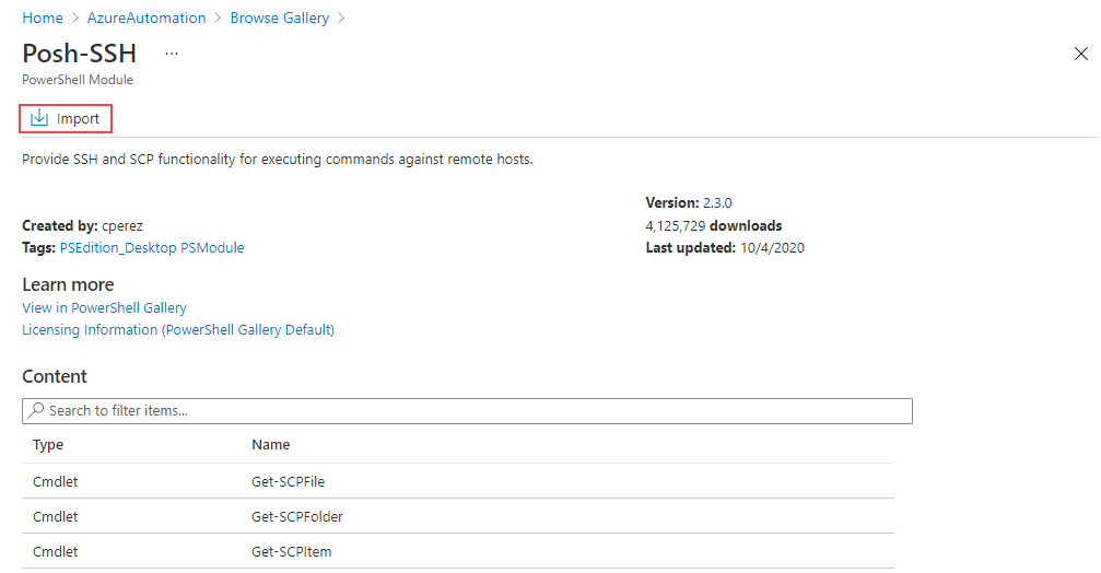 仅可使用 Azure 门户直接从 PowerShell 库导入。 不能使用 PowerShell 执行此功能。 此过程与使用 Azure 门户从 GitHub 导入 runbook所述的相同,不同之处在于源为 PowerShell 库 。