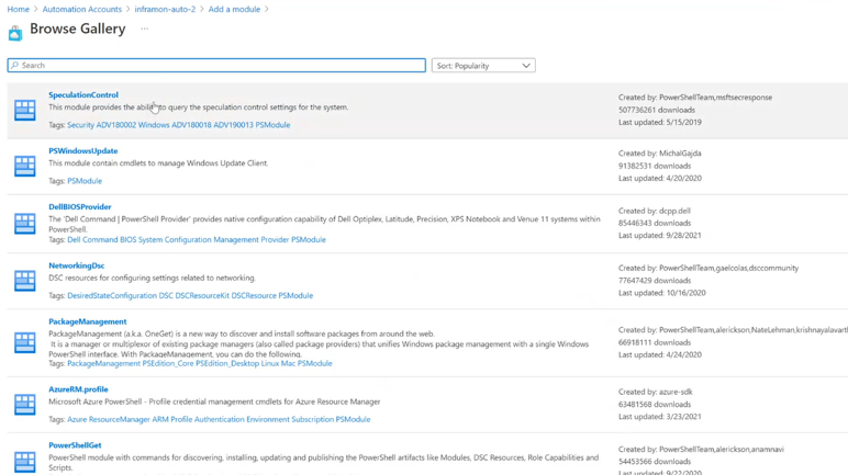 你还可以在 Azure 门户中找到要导入的模块。 在“共享资源”下的“模块”中为自动化帐户列出了这些模块 。