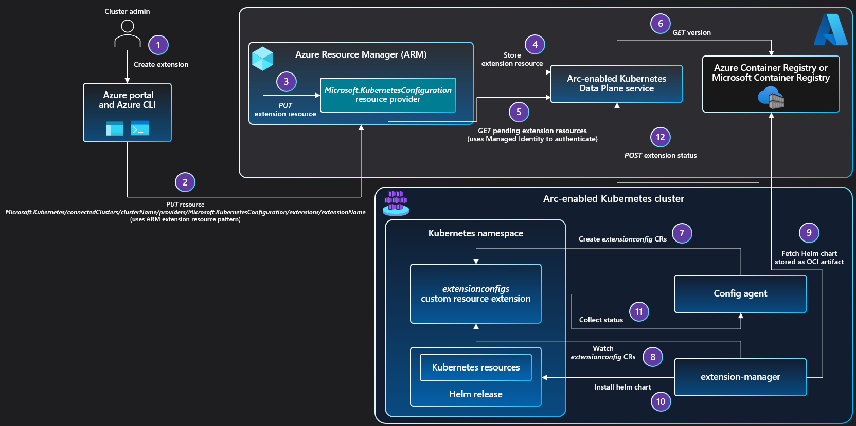 在群集上运行的 config-agent 组件会跟踪已启用 Azure Arc 的 Kubernetes 资源上的新增和更新的扩展资源。 在群集中运行的 extensions-manager 代理会读取需要安装的扩展类型。 然后,它会从 Azure 容器注册表或其他 Azure 服务中拉取关联的 Helm 图表,并将其安装到群集上。