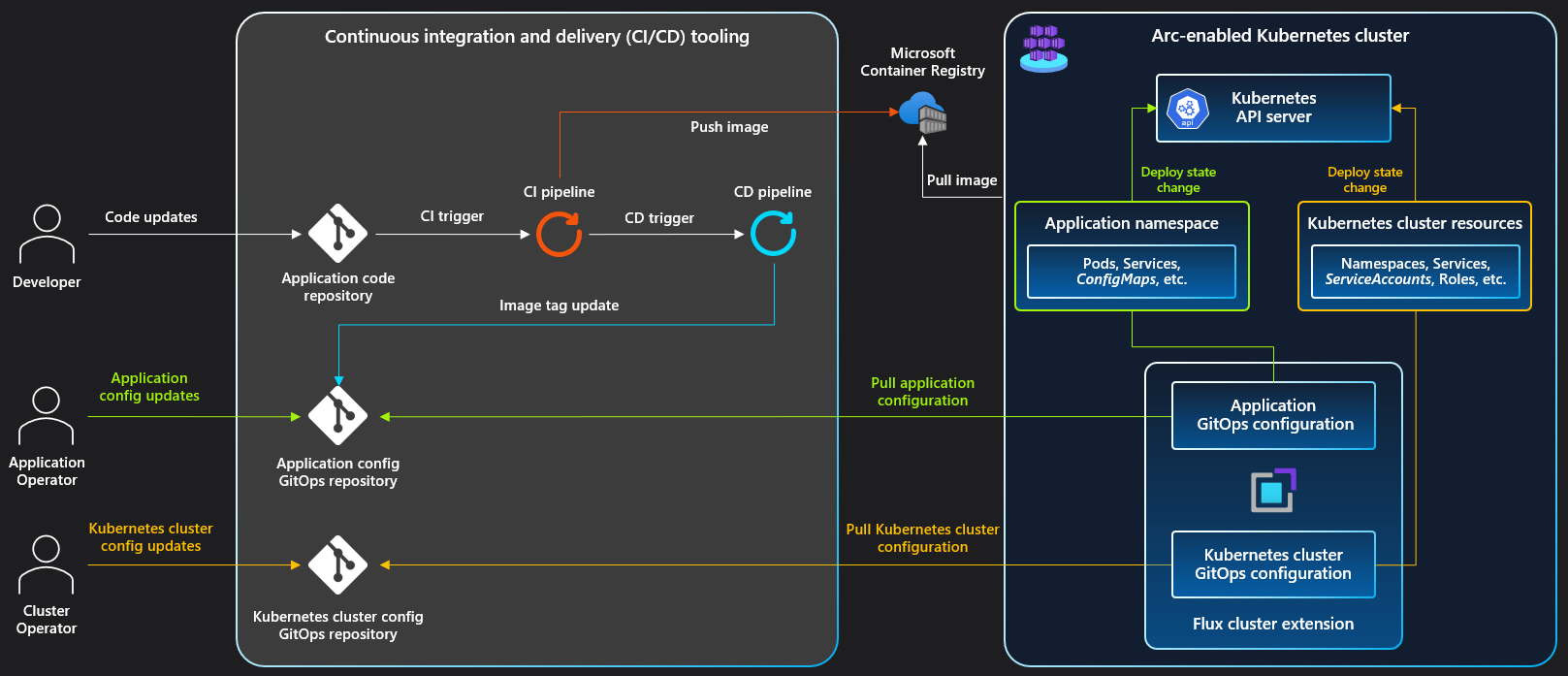 本文介绍 GitOps 如何与使用 Azure Arc、Azure Repos 和 Azure Pipelines 的完整应用程序变更生命周期相结合。 它还提供了对 GitOps 控制的 Kubernetes 环境进行单个应用程序更改的示例。