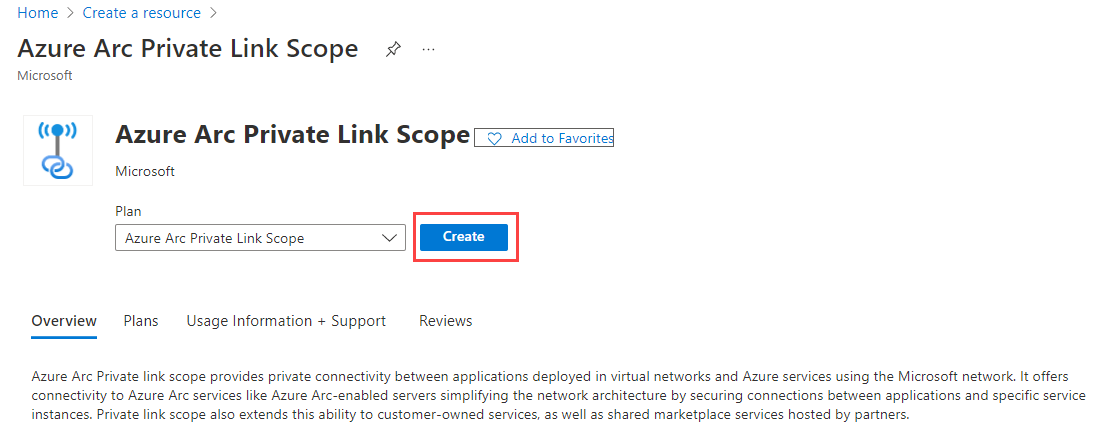 直接转到门户中的 Azure Arc 专用链接范围页面,然后选择“创建 Azure Arc 专用链接范围”。