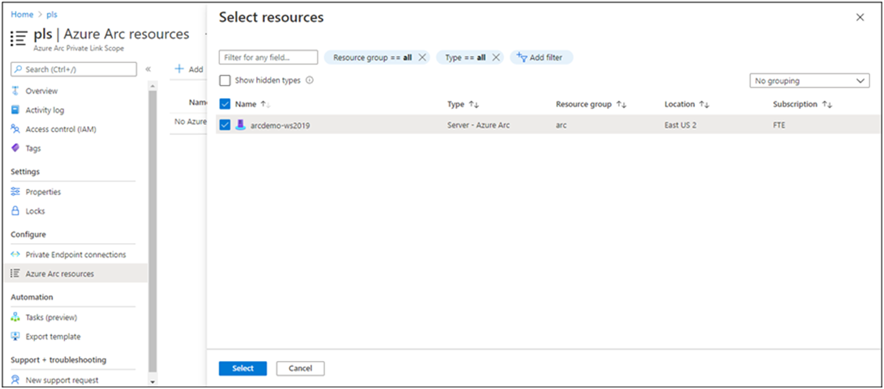 选择要与专用链接范围关联的列表中的服务器,然后选择 “选择” 以保存更改。