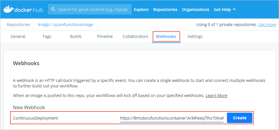 打开 Docker Hub 并登录,然后在导航栏上选择“存储库”。 找到并选择映像,选择“Webhook”选项卡,指定一个 Webhook 名称,将 URL 粘贴到“Webhook URL”中,然后选择“创建”。