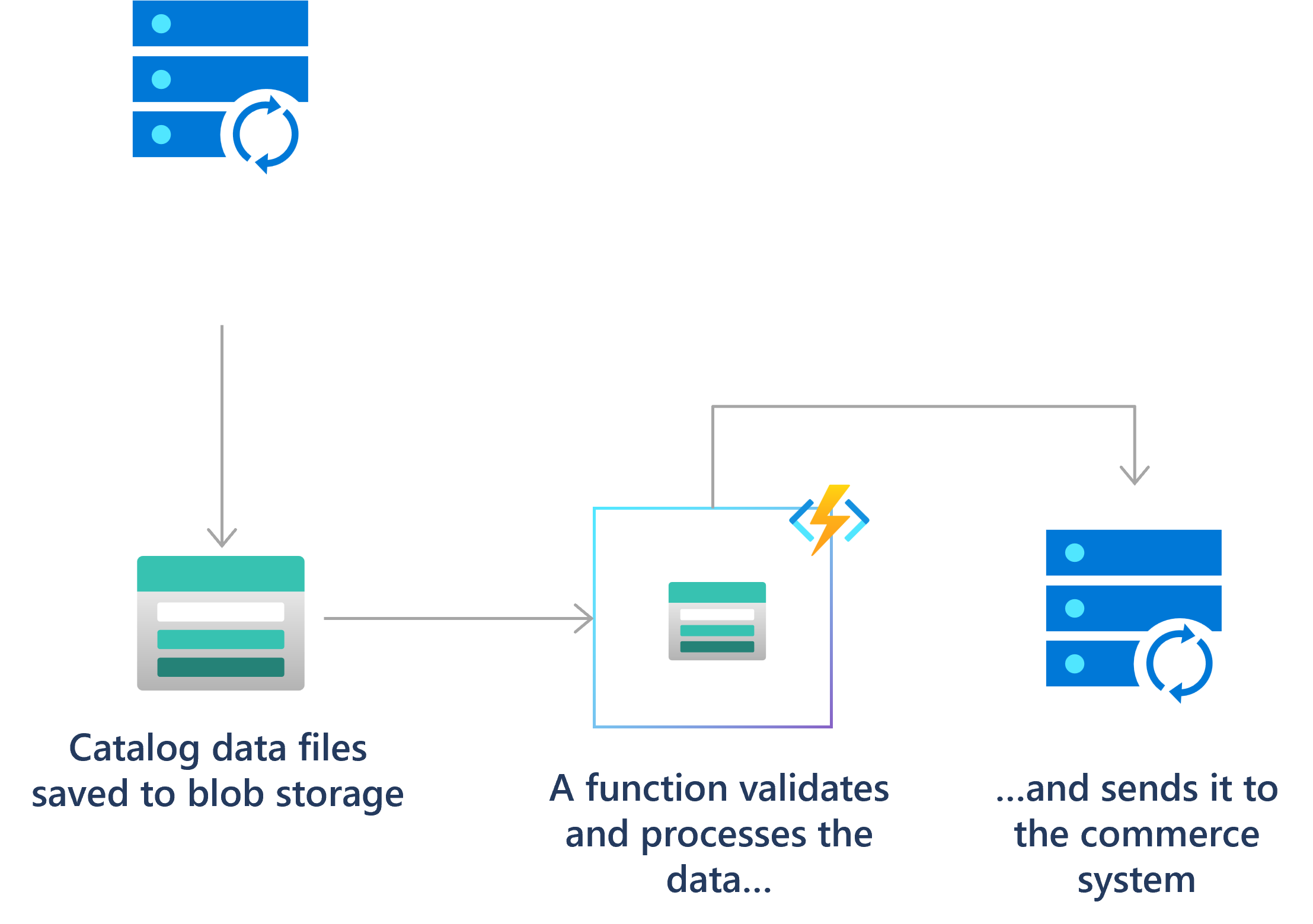 例如,在零售解决方案中,合作伙伴系统可以将产品目录信息作为文件提交到 blob 存储中。 上传文件时,可以使用 Blob 触发的函数验证、转换和处理文件到主系统中。