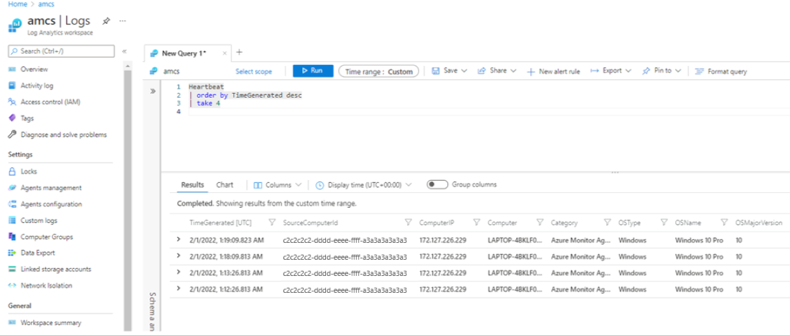 在你在 DCR 中指定为目的地的 Log Analytics 工作区中,检查 Heartbeat 表及你在规则中配置的其他表。