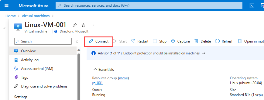 与要在其中安装 Telegraf 的 VM 建立 SSH 连接。 选择虚拟机概述页上的“连接”按钮。