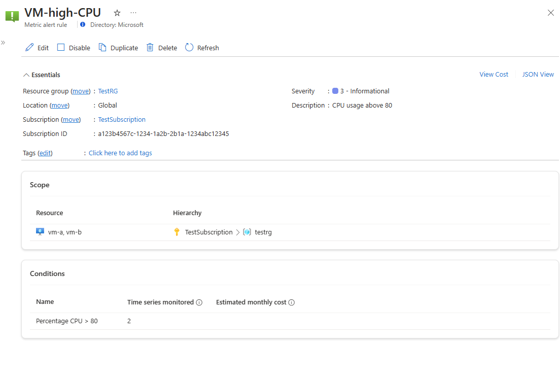 为避免额外的成本,默认情况下每个警报规则最多可监视 5,000 个时序。 若要提升你的订阅中的此限制,请创建一个支持票证。