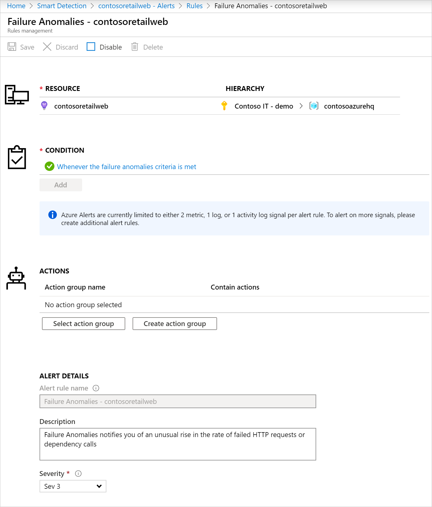 此警报规则是与名为“Application Insights 智能检测”的操作组 相关联创建的。默认情况下,此操作组包含电子邮件 Azure 资源管理器角色操作,并向在您的订阅中拥有监视参与者或监视读取者 Azure 资源管理器角色的用户发送通知。 可以移除、更改或添加规则触发的操作组,就像对待任何其他 Azure 警报规则一样。 通过该警报规则发送的通知需遵循常见警报架构。