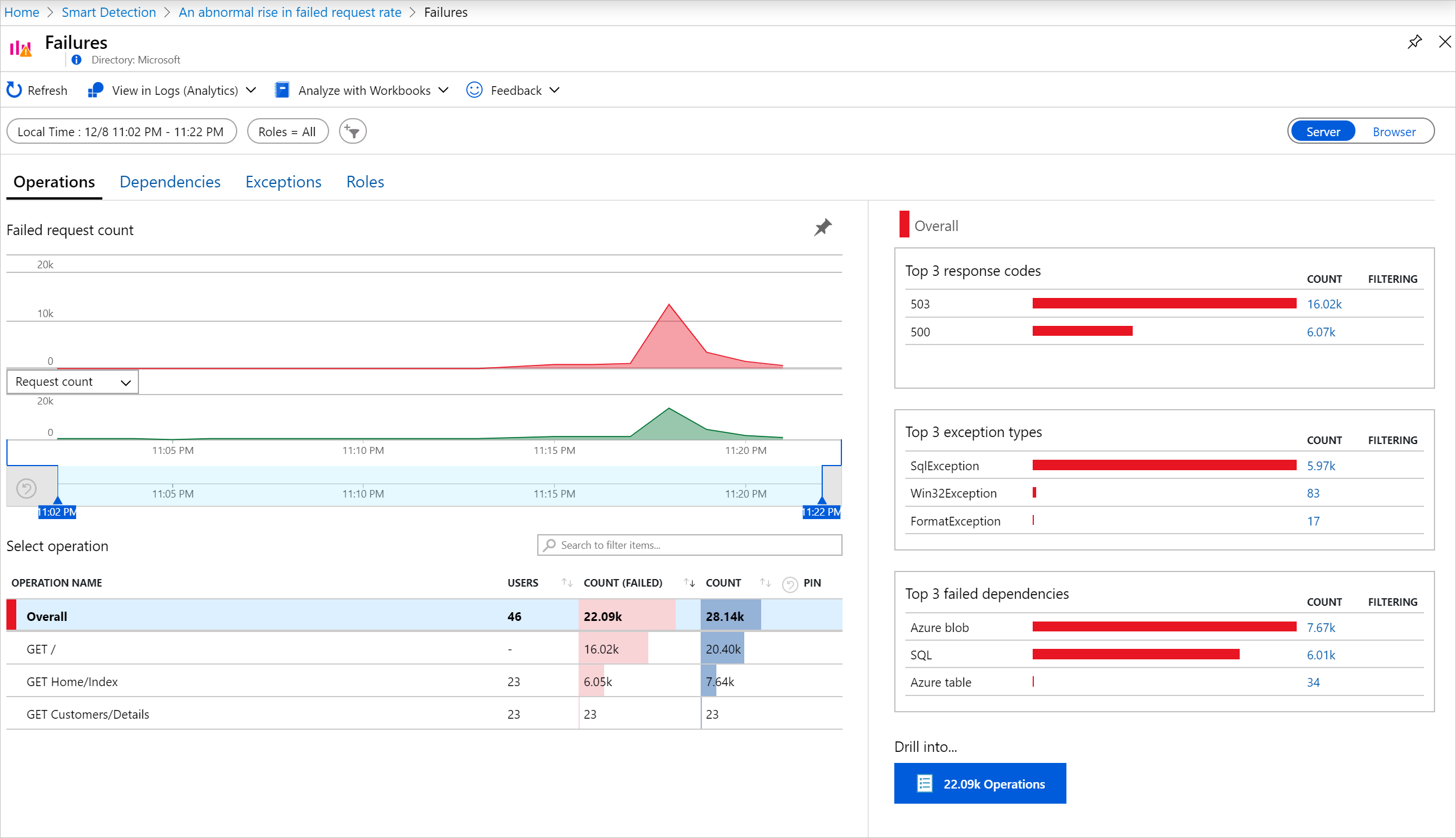 - 我们检测到与之前一段时间的正常基线相比,失败请求率中出现异常上升。 对失败和关联应用程序数据进行分析后,我们认为存在问题并且你应当给予关注。