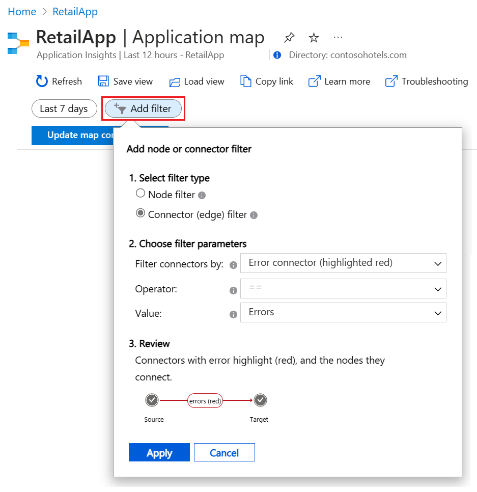 配置并查看筛选器设置后,选择“应用”以创建筛选器。 可以将多个筛选器应用到同一应用程序映射。 在应用程序映射中,应用的筛选器显示为映射上方的药丸: