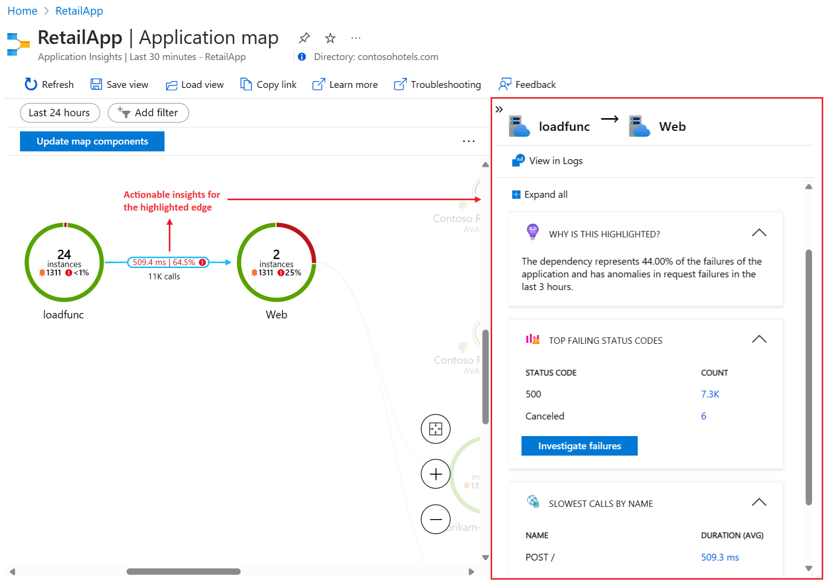 显示应用程序映射中所选边缘的可操作见解的屏幕截图。