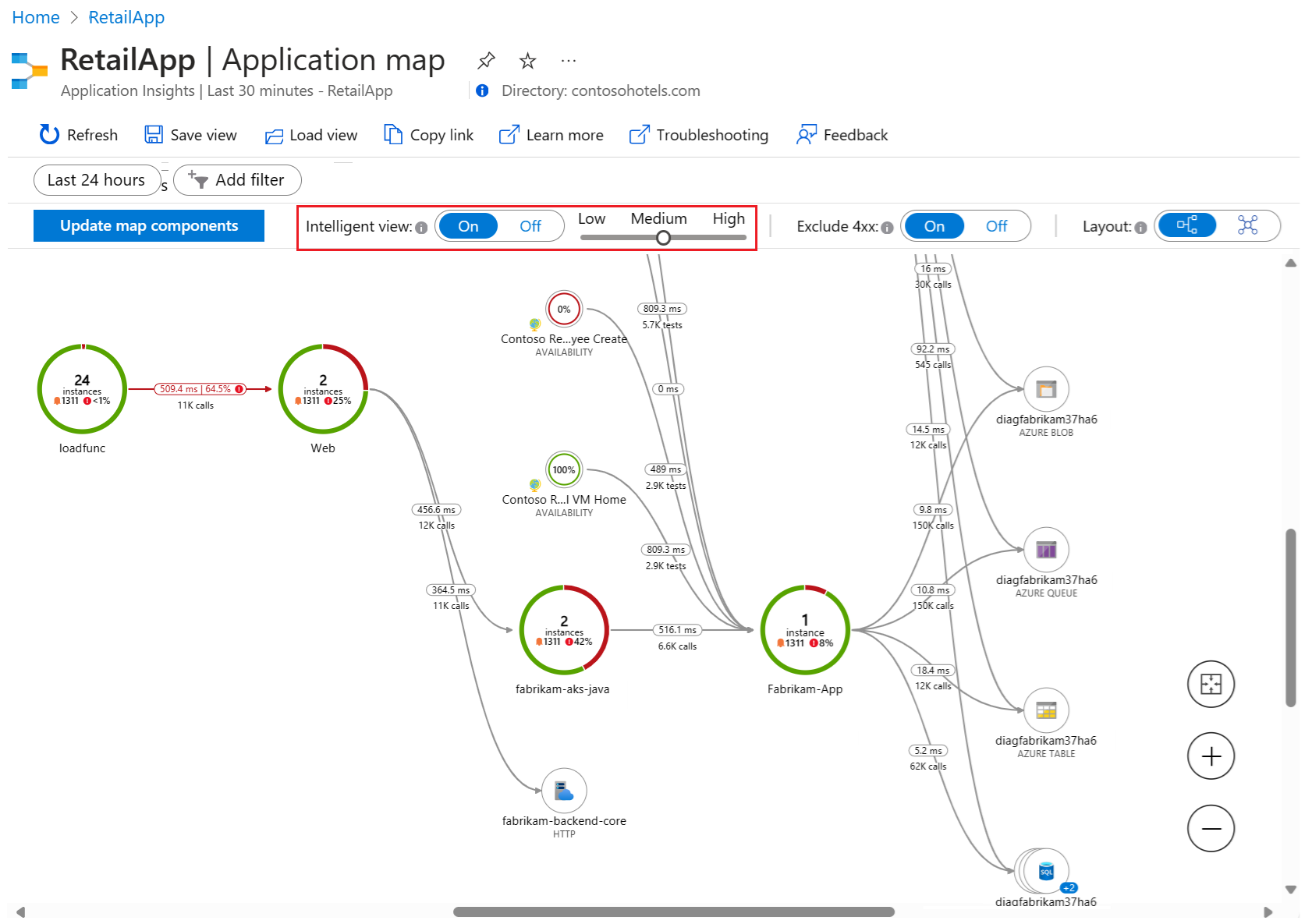 应用程序映射还提供智能视图,用于帮助快速调查服务健康状况。