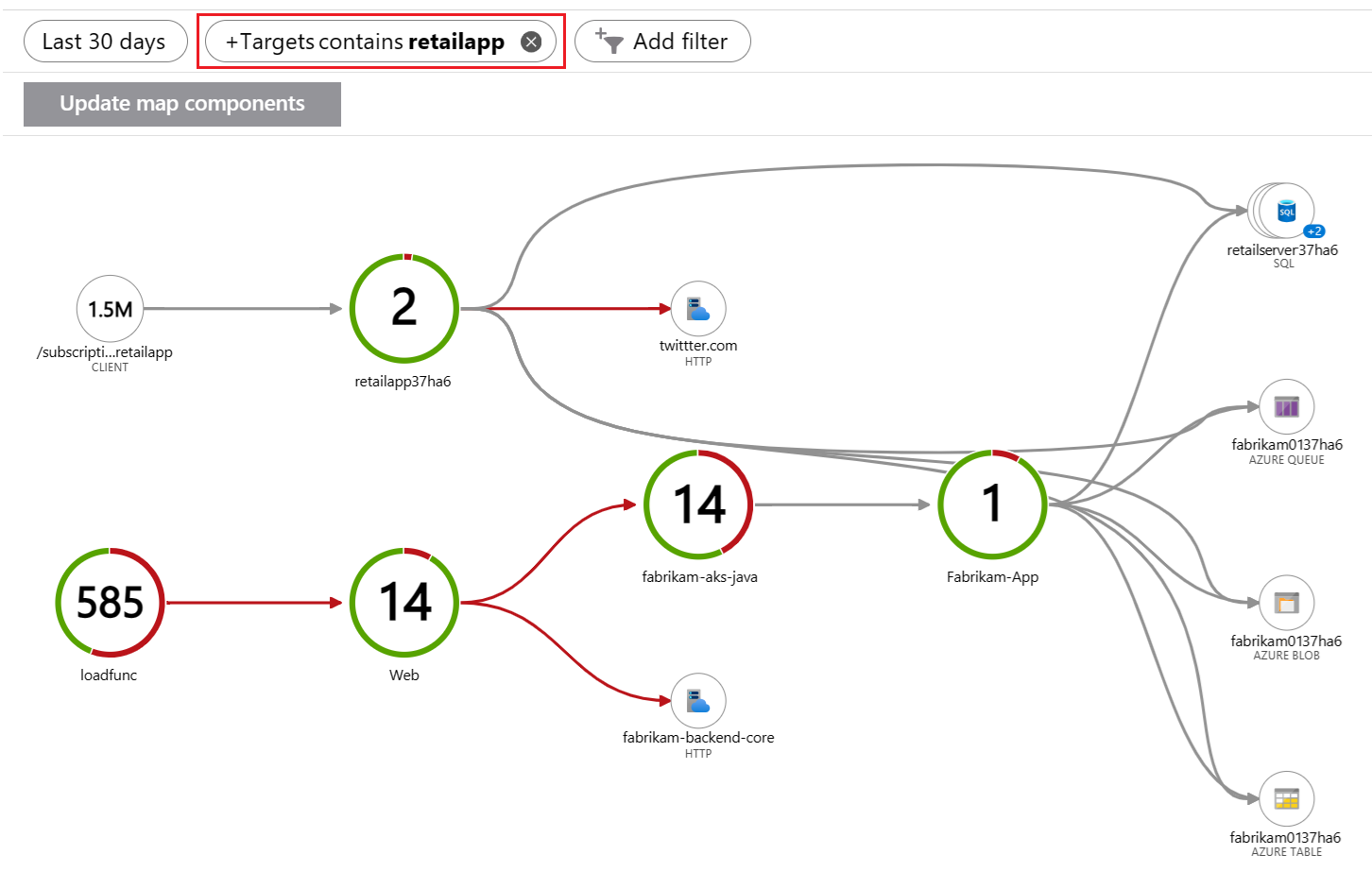 下图显示了应用于应用程序映射的筛选器示例,其中显示了 30 天的数据。 筛选器指示应用程序映射搜索包含文本“retailapp”的属性的节点和连接的目标: